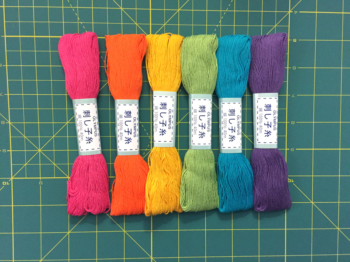 My mother-in-law got me a few of the sashiko kits and a couple colors of thread. I bought some more colors from TaDaa Studio Stitch on Etsy and decided to make a bit of a rainbow. Sashiko thread is cotton but it’s thicker than DMC and it doesn’t split into smaller strands. I did another little sashiko project and used 6 strands of DMC and it worked just fine. So if you want to try out sashiko but are put off by the supplies, just go ahead and try it with what you’ve got!